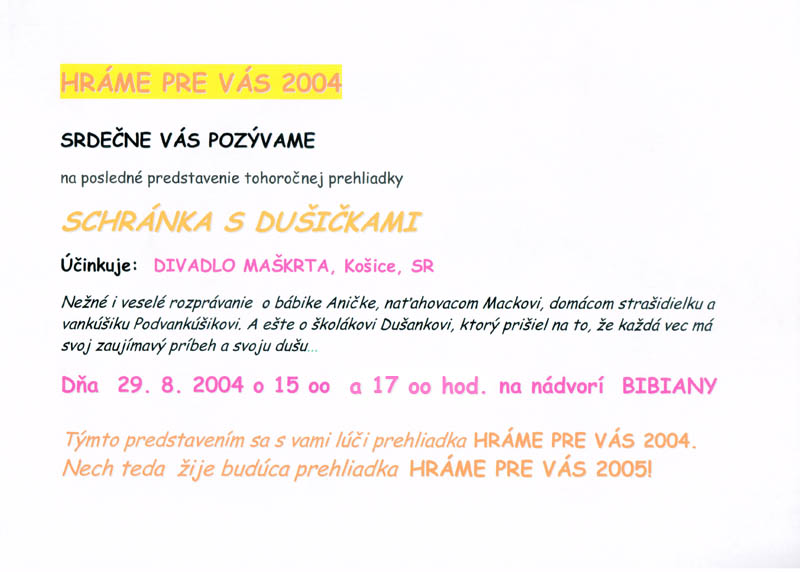 This tender and cheerful story is about big ghosts and little souls. A magical orchestrion tells a tale about the puppet Anička with her soul sick of love, wind-up Bear, and pupil Dušanko who has a small soul when he his alone in his cot. You will also see the ghost Spirit of Home who is afraid to spook, and the night ghost Underpillow (Podvankúšik). Believe it or not, everything has a soul! That is what this story is mainly about.