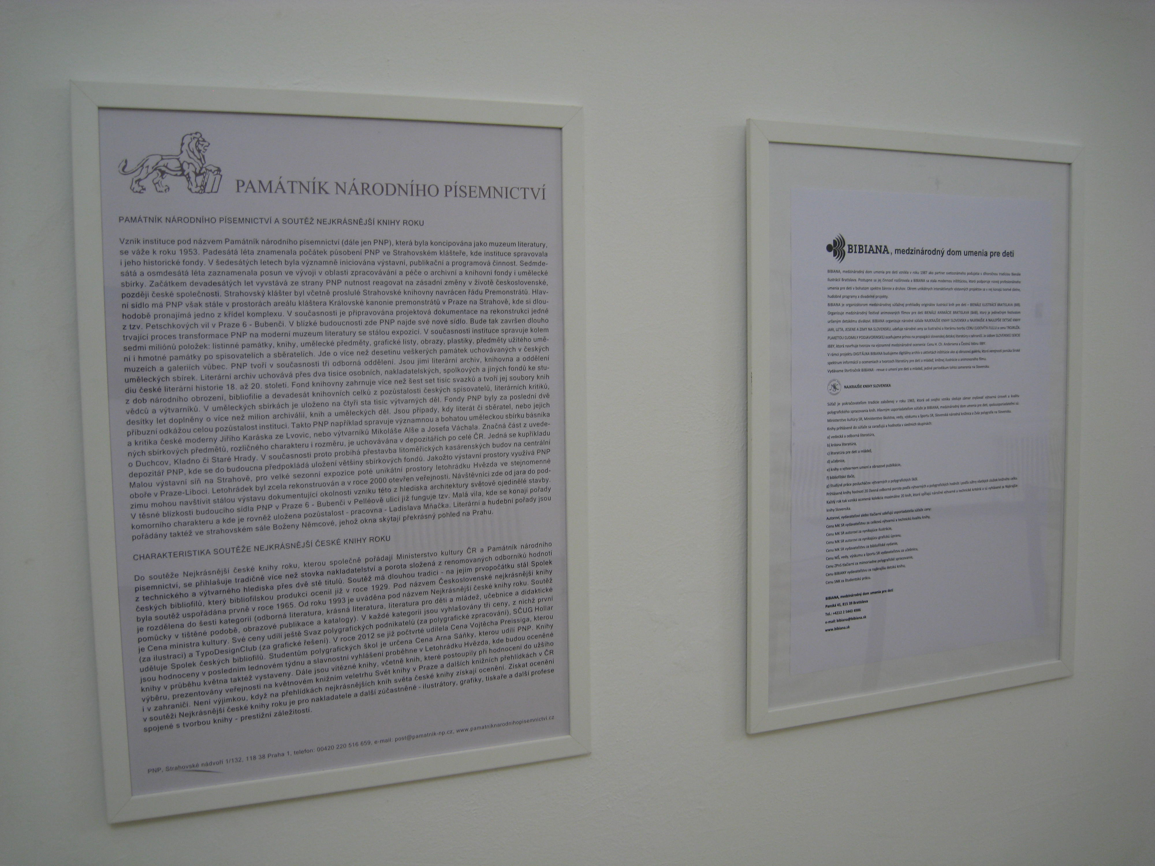 Výstava prezentuje výber kníh ocenených v súťažiach Nejkrásnější české knihy roku a Najkrajšie knihy Slovenska z ostatných piatich ročníkov súťaže 2008 – 2012. Ide o knihy, ktoré získali 1. cenu v kategórii Literatúra pre deti a mládež a Cenu BIBIANY za najkrajšiu detskú knihu. Ku každej knihe je informácia o ilustrátorovi a ilustrácie z ocenenej knihy. Súčasťou výstavy je základná informácia o BIBIANE, Památníku národního písemnictví a oboch súťažiach.