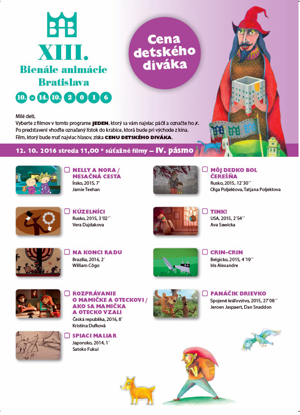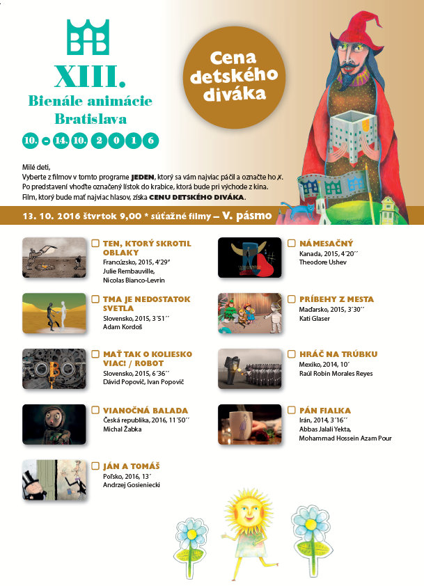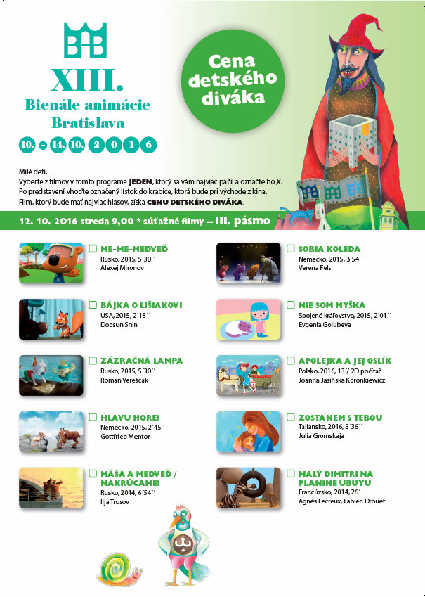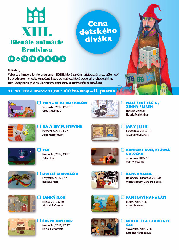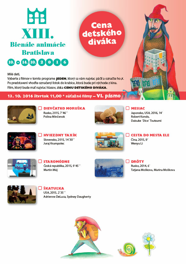 Premietania pre deti v dňoch 11. – 13. októbra 2016 sa konali v Dome kultúry Dúbravka, v Dome kultúry Zrkadlový háj, v kine Nostalgia-Nivy a v kine Mladosť v Bratislave a v Kunsthalle, KOŠICE, kino Scala, PREŠOV a kino Baník/ArtPoint, PRIEVIDZA. Podujatia sa konali paralelne vo všetkých mestách .