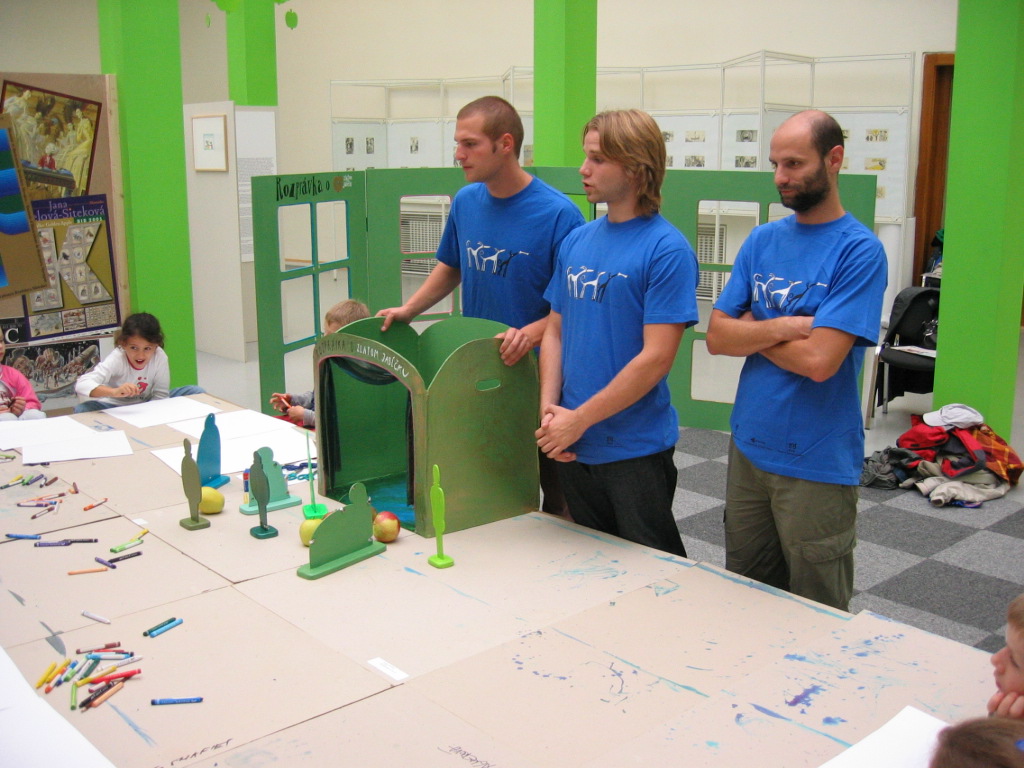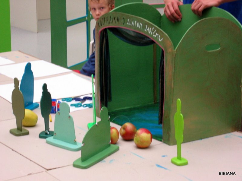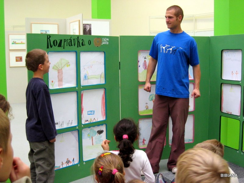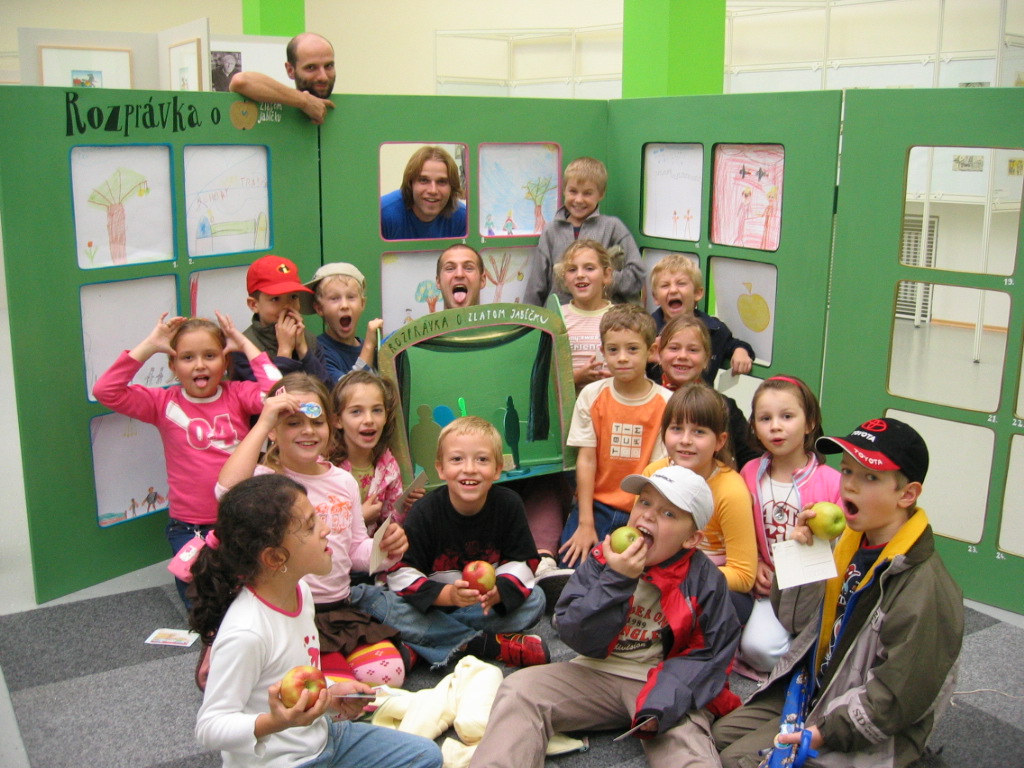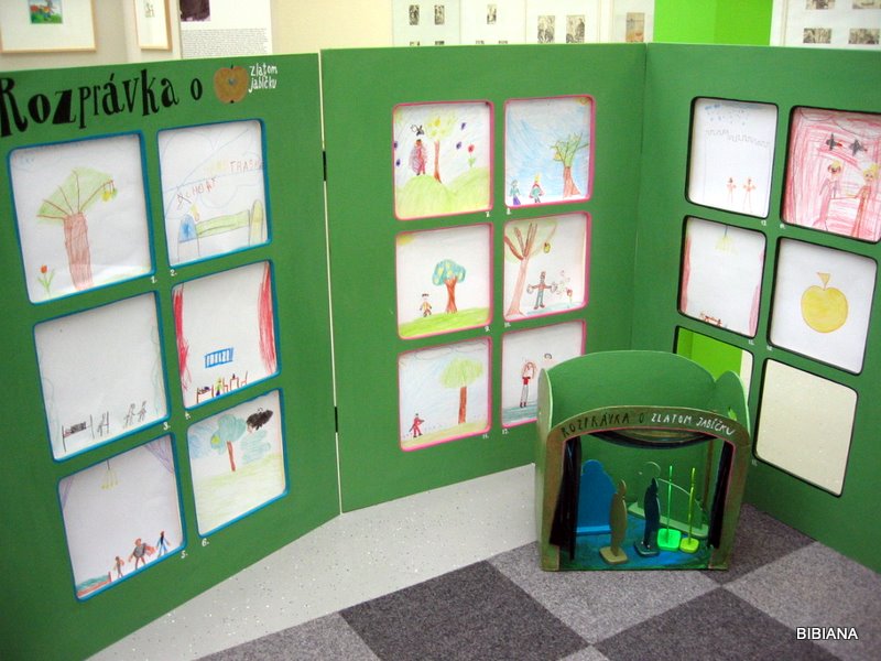 Rozprávka o zlatom jablku rámcuje tvorivé výtvarné aktivity detí. Zároveň je zlaté jablko symbolom ocenených ilustrácií. Deti vytvárali komiks o ceste troich synov za zlatým jabkom , leporelo alebo divdelné kulisy a plošné bábky.