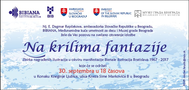 V Mestskom múzeu Belehrade v krásnych historických priestoroch Konak Kneginje Ljubice bola dňa 30.9.2019 otvorená výstava „Na krídlach fantázie“, ktorú pripravila BIBIANA, medzinárodný dom umenia pre deti Bratislava. Bol to výber toho najlepšieho zo všetkých doterajších ročníkov BIB. Výstava mala tri časti: nositelia najvyššieho ocenenia BIB Grand Prix, Slováci ocenení na bienále a víťazi detskej poroty. Výstavu spolu otvorili slovenská veľvyslankyňa v Srbsku pani Dagmar Repčeková, Jozef Švolík generálny riaditeľ sekcie umenia ministerstva kultúry Slovenskej republiky, Jelena Medakovič riaditeľka Mestského múzea a Peter Tvrdoň riaditeľ BIBIANY. Výstava potrvá do 14. októbra 2019. Okrem samotnej výstavy sme pripravili aj dva workshopy (Nový Sad a Belehrad), ktoré viedol slovenský výtvarník Miroslav Regitko.