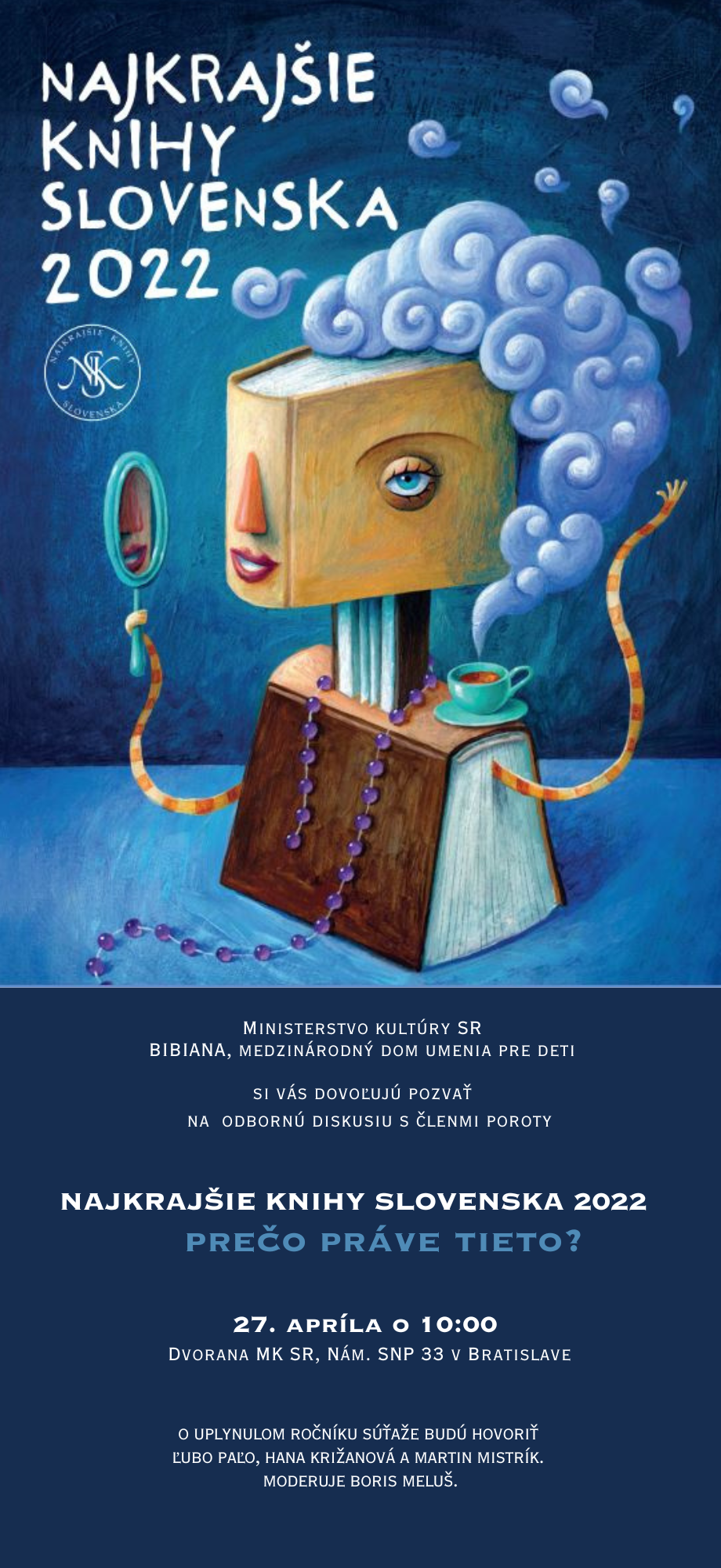 Chcete sa dozvedieť, ako porota súťaže vyberala finálovú dvadsiatku a prečo niektorým titulom udelila špeciálne ceny? Príďte na odbornú diskusiu s členmi poroty Ľubom Paľom, Martinom Mistríkom a Hanou Križanovou vo Dvorane MK SR, moderuje Boris Meluš. Priamo na mieste si môžete knihy pozrieť a vyjadriť svoj názor.