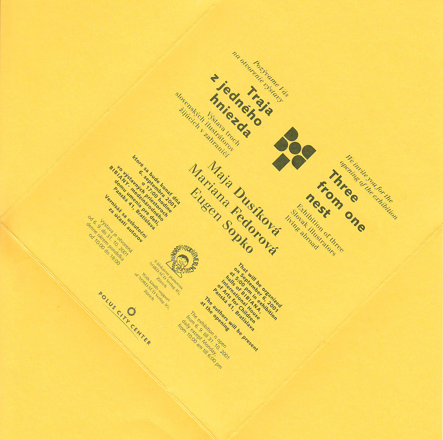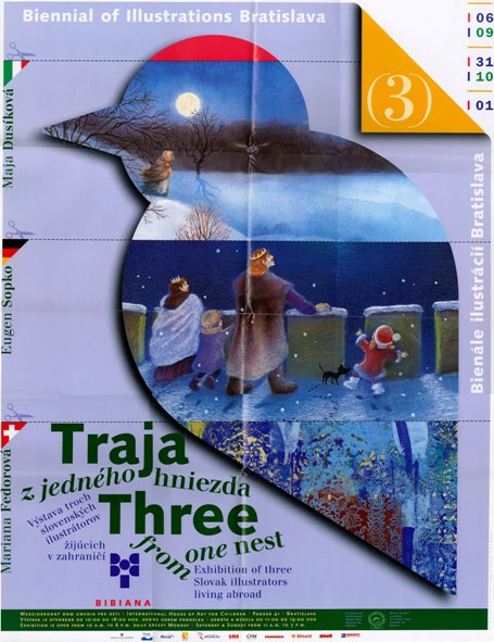 Reprezentatívna expozícia ilustrácií troch slovenských ilustrátorov žijúcich v zahraničí. Sú to Maja Dusíková (žijúca v Taliansku), Eugen Sopko (žijúci v Nemecku) a Mariana Fedorová (žijúca vo Švajčiarsku). Výstava bola komparáciou vplyvov týchto krajín na slovenských tvorcov a pozitívnu konfrontáciu so slovenskou i svetovou tvorbou v širších súvislostiach.